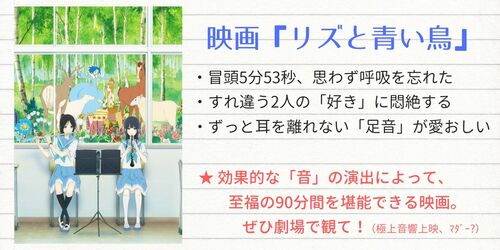 映画『リズと青い鳥』の感想レビュー記事。『響け!ユーフォニアム』シリーズのスピンオフ劇場版。みぞれと希美、2人の間ですれ違う「好き」の感情に悶絶させられた。