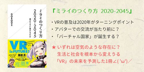 GOROman著『ミライのつくり方 2020-2045』の感想記事。日本国内におけるVR普及の変遷と、今後の展望についてまとめた1冊。