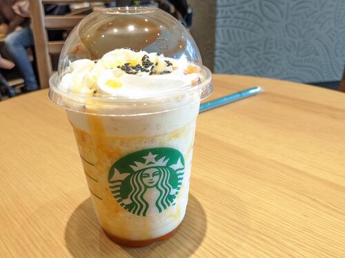 スターバックスコーヒーの2020年秋の季節限定商品「大学芋フラペチーノ」の感想記事。アプリを使って先行体験。